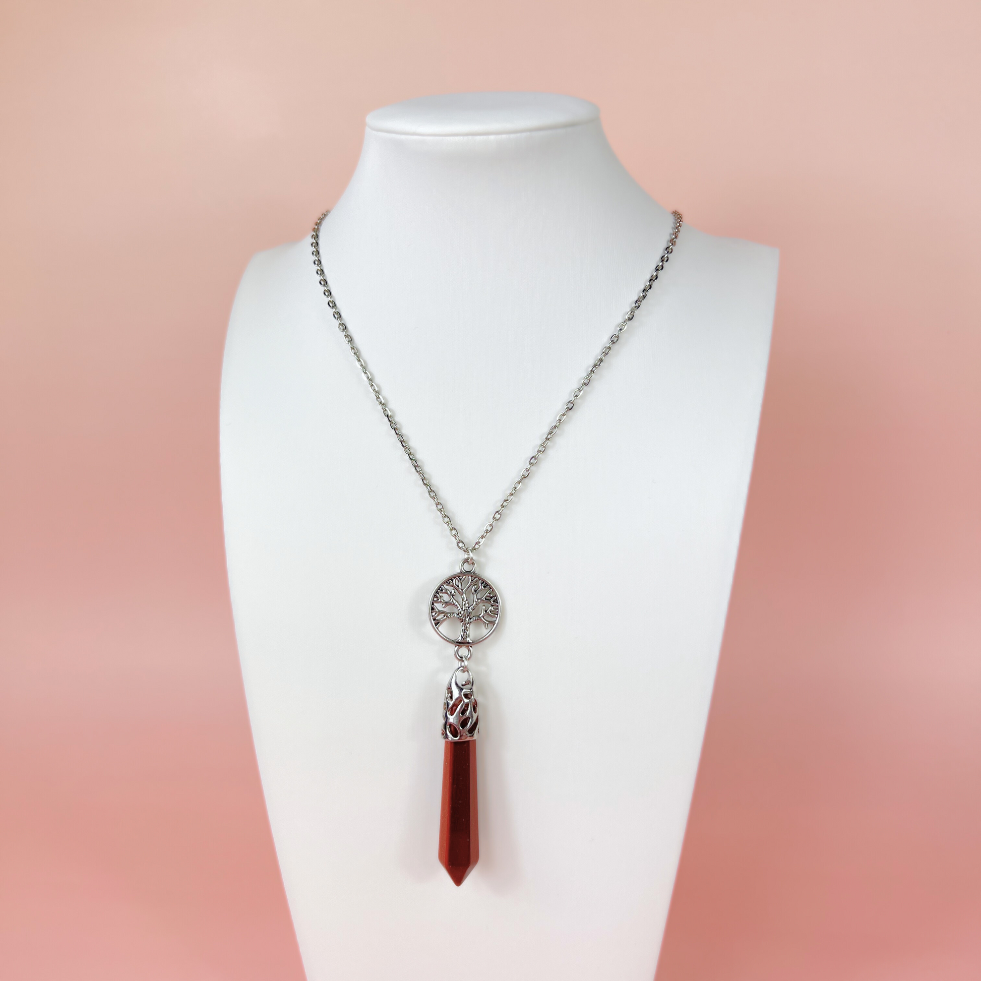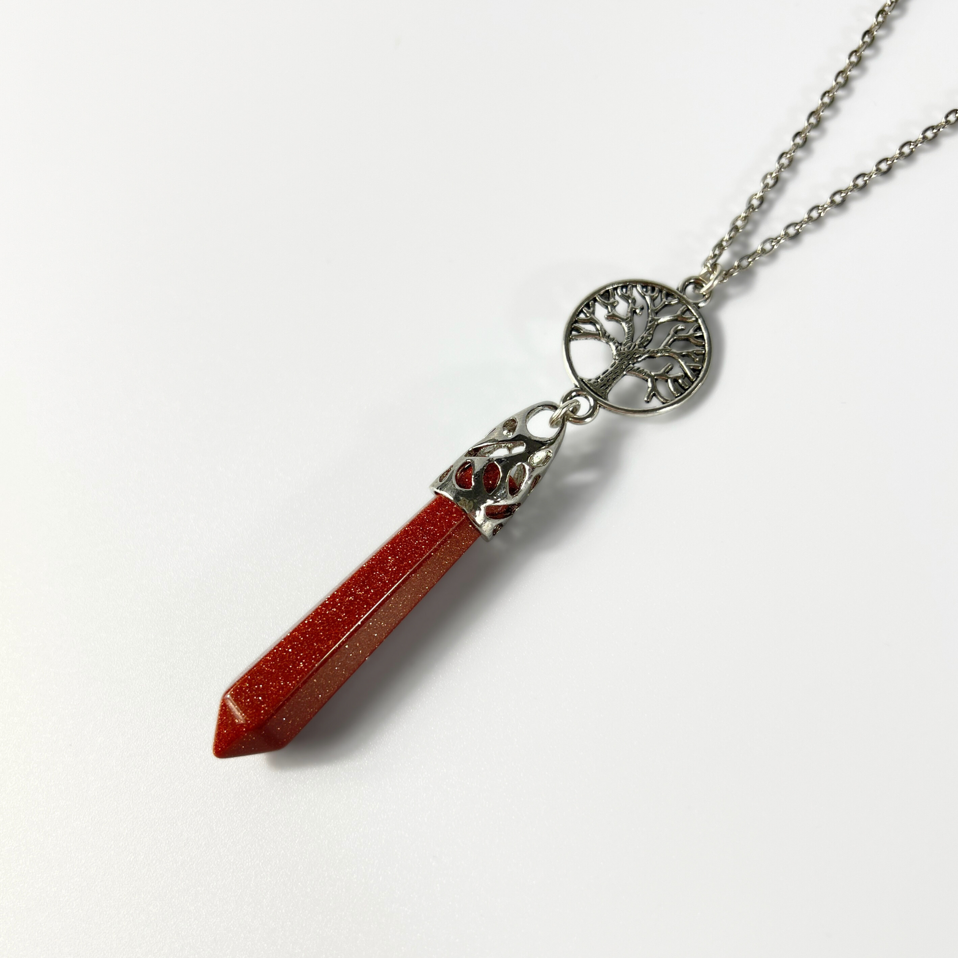 Captant la lumière dans tous ses reflets, ce collier en pierre dorée est orné d'un symbole d'arbre de vie.