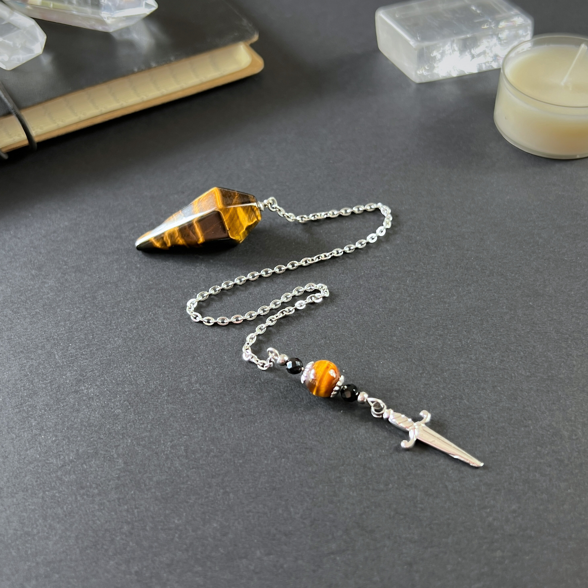 Doté d'un carré en œil de tigre et d'une chaîne élégante en acier inoxydable qui ne ternit pas. La chaîne est ornée de deux perles d'onyx à facettes et d'une perle en œil de tigre, élégamment couronnées de capuchons fantaisie, car oui, même vos outils méritent d'être élégants. Et à la fin ? Un poignard, ou athamé, pour les connaisseurs, symbolisant la précision, la concentration et l'ambiance inimitable de « J'ai ça ».