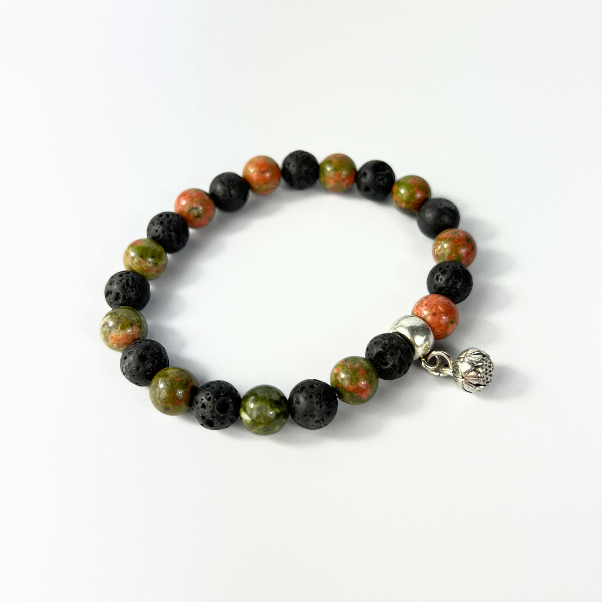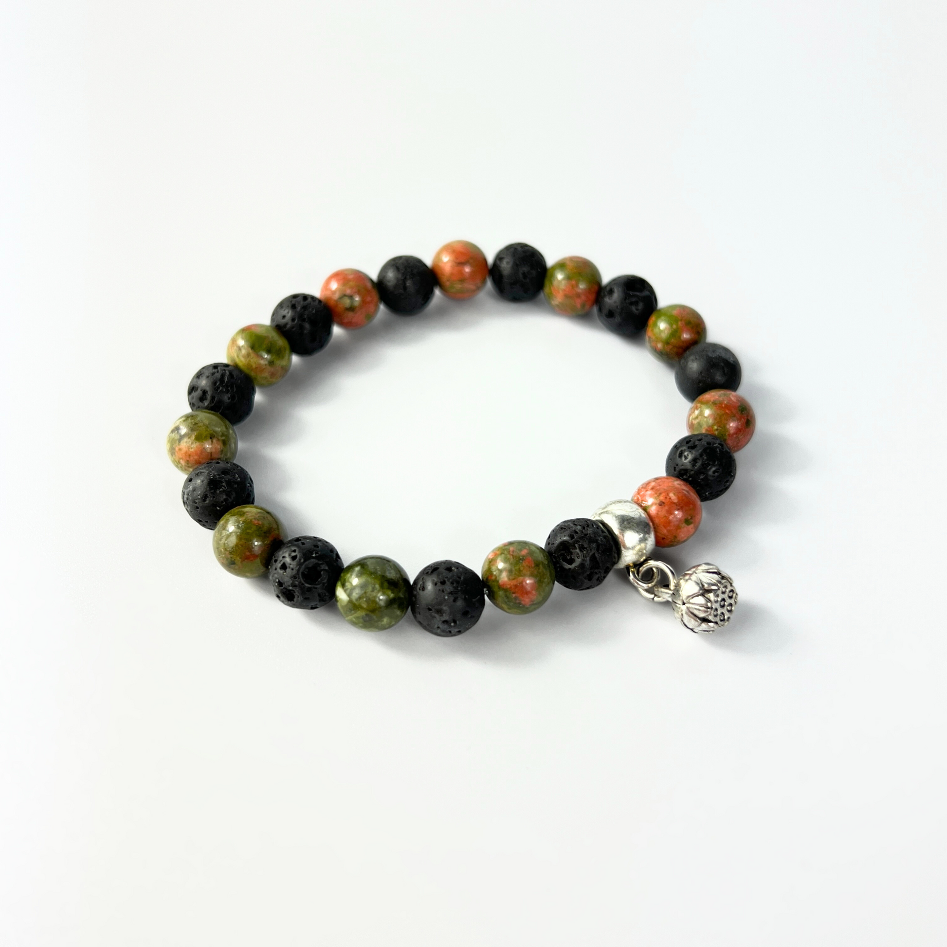 Bracelet en perles d'unakite et de lave mala avec un charme de graine de lotus