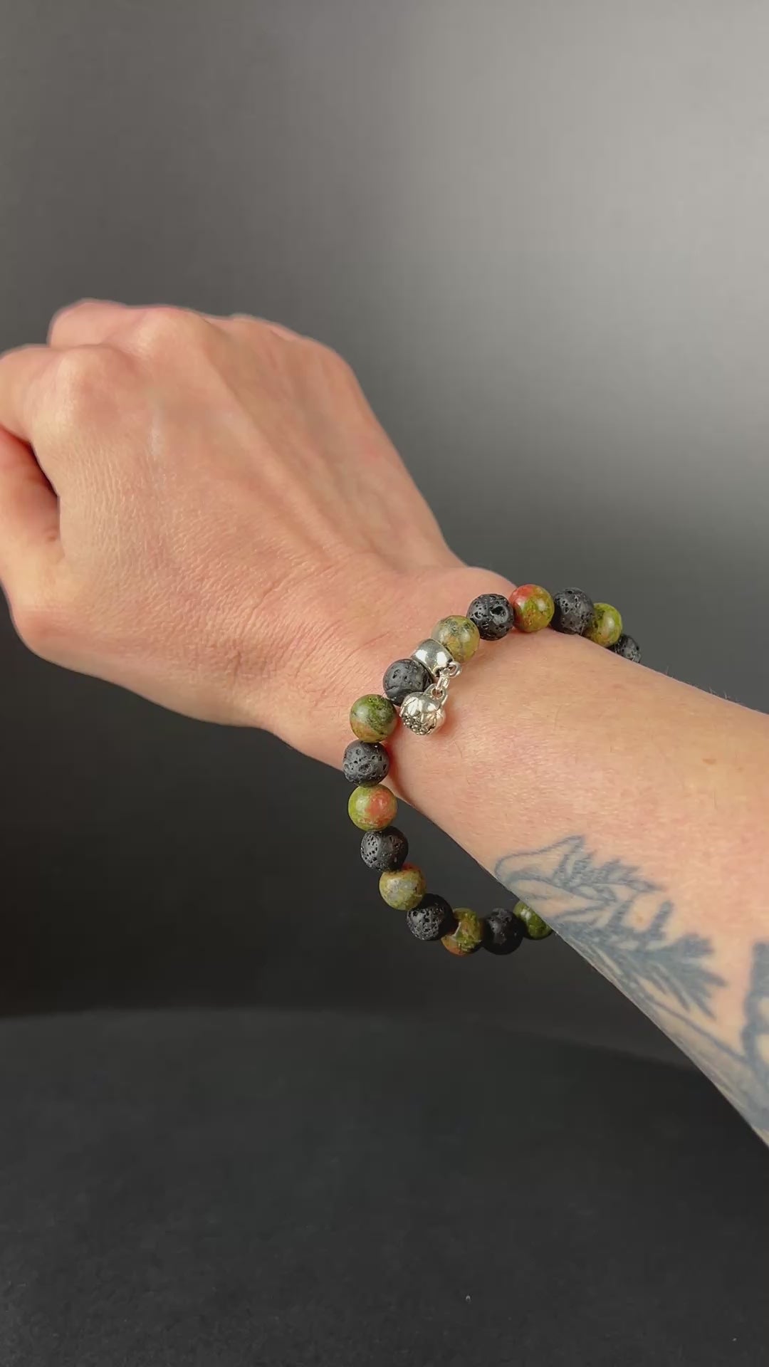 Vous aurez envie de porter tous les jours ce bracelet en unakite et pierres précieuses de lave, agrémenté d'une breloque graine de lotus. Ce bracelet est fait à la main avec des perles de 8 mm et du fil de cristal haute résistance.