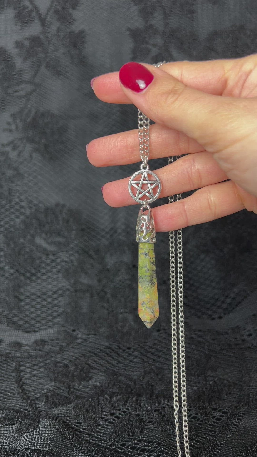 Ce collier pendule en Unakite vous aidera dans toutes vos pratiques (divination, radiesthésie, soins énergétiques, sorcellerie, reiki...), ou ajoutera tout simplement une touche witchy à votre tenue.