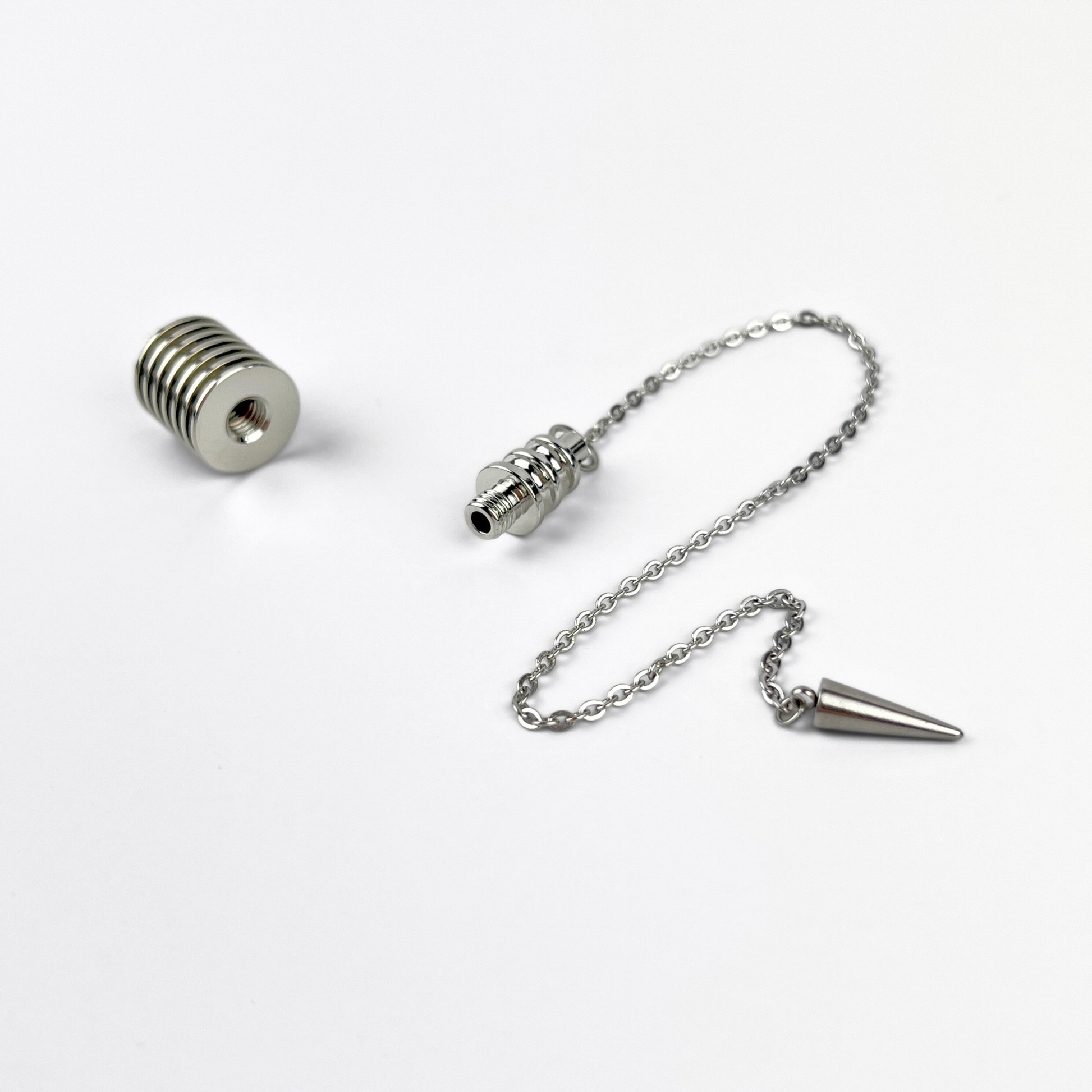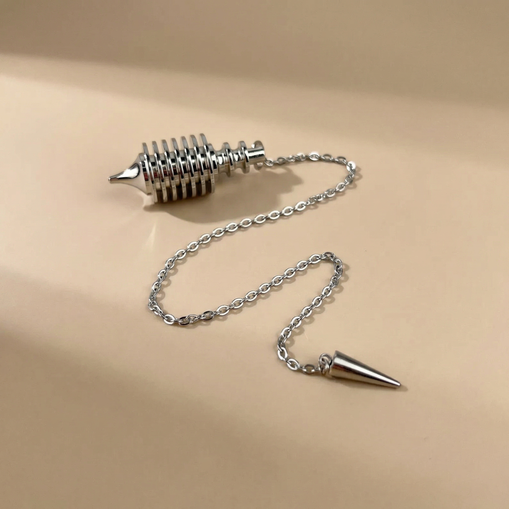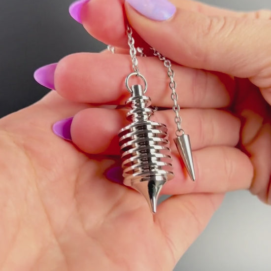 The 7 coils pendulum is 4.09 cm x 1.57 cm (1.61 x 0.61 in), and the chain is 22 cm (8.66 in) long. A little point charm finishes the chain. The weight of the pendulum is 20.26 grams for the bob only, and 23.24 grams including the chain.