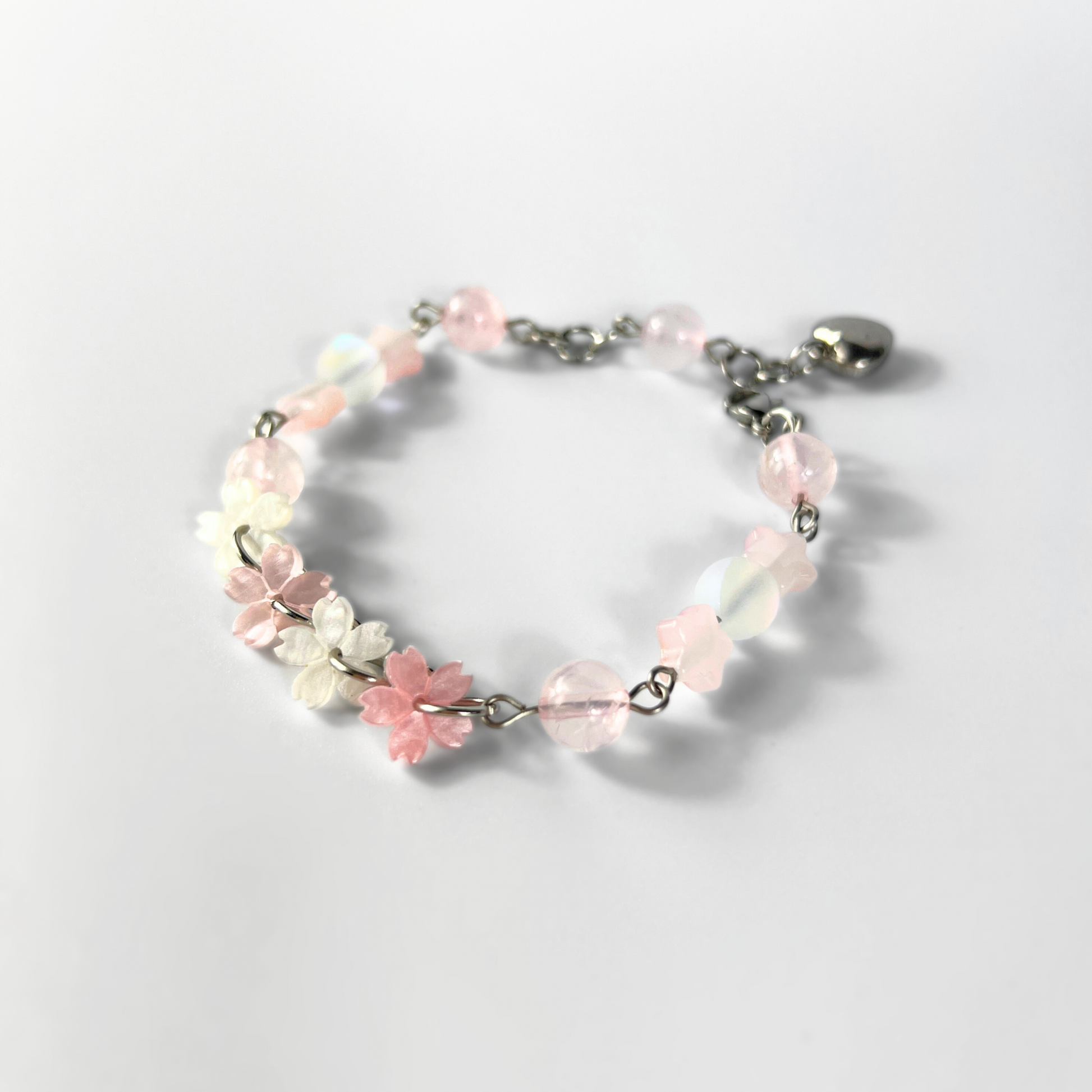 Crafted with stainless steel for a forever-perfect look, it features delicate rose quartz beads—aka the love stone. Paired with mermaid holographic glass beads that glow with subtle iridescence, and adorned with sakura flowers in blush pink and white, this bracelet captures the fleeting beauty of cherry blossoms in full bloom. Tiny pink acrylic stars sprinkle in a little extra magic, and at the end? A chunky 3D heart charm that says, yes, I am adorable, and no, I will not apologize for it.