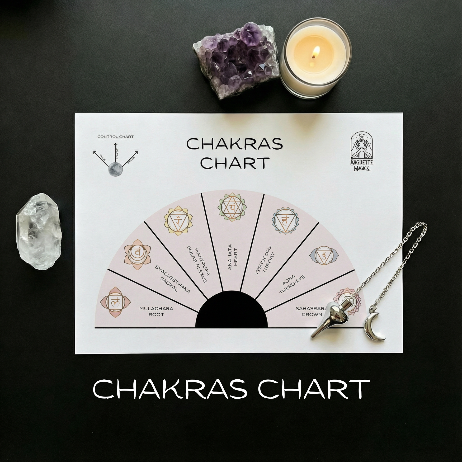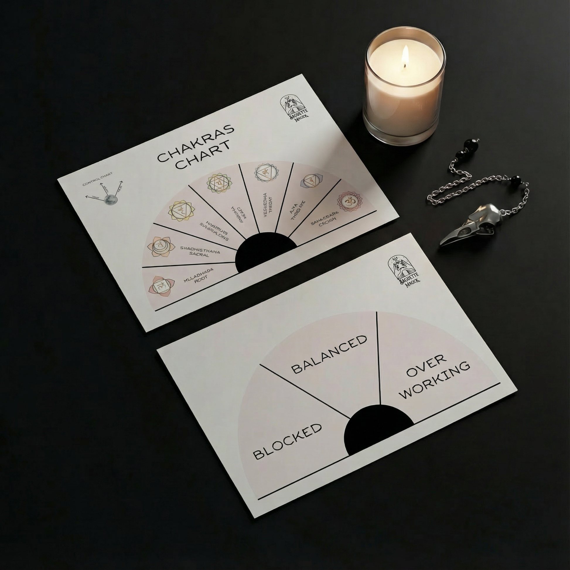Two pendulum boards to practice dowsing and ask your questions about chakras. This is the perfect pack of charts to know on which chakra you may focus.