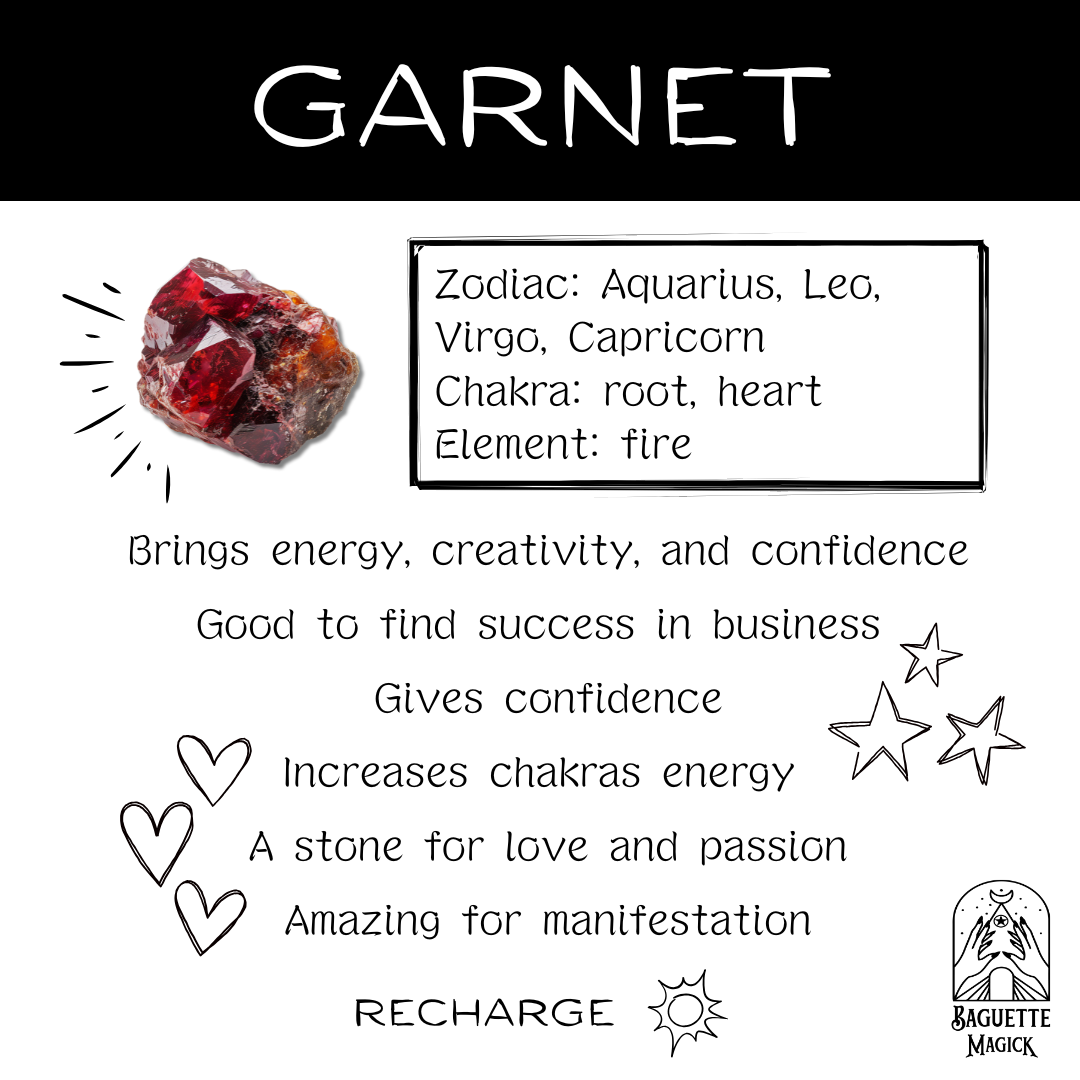 Garnet: boosts energy, creativity, and passion. It’s tied to the root and heart chakras and helps you stay grounded while shining bright.
