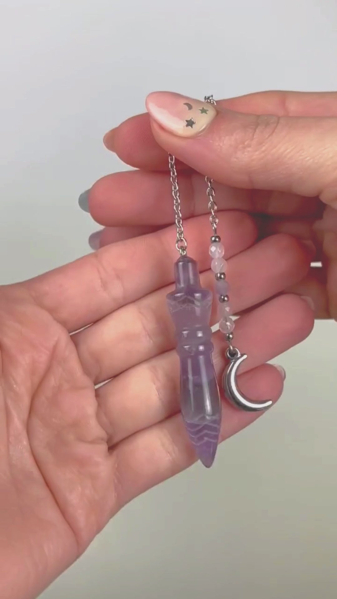 Engraved Egyptian Thot pendulum, Amethyst, Rose Quartz, Moon crescent charm