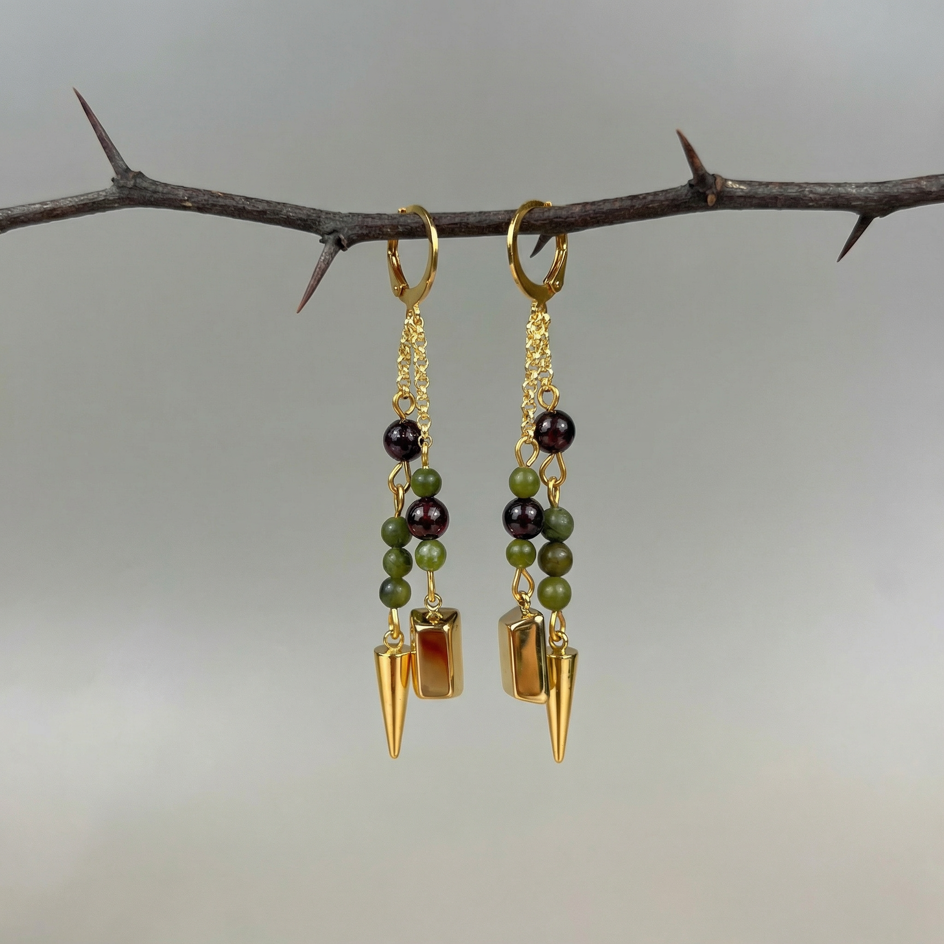 The design features a comfortable lever-back clasp with two dangling strands. The front strand holds the gold bar charm, while the longer strand behind ends in a pointed charm. Both are adorned with 4 mm green jade and 6 mm garnet beads for a perfectly balanced look and energy.