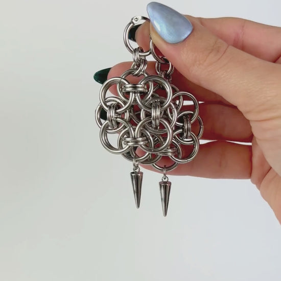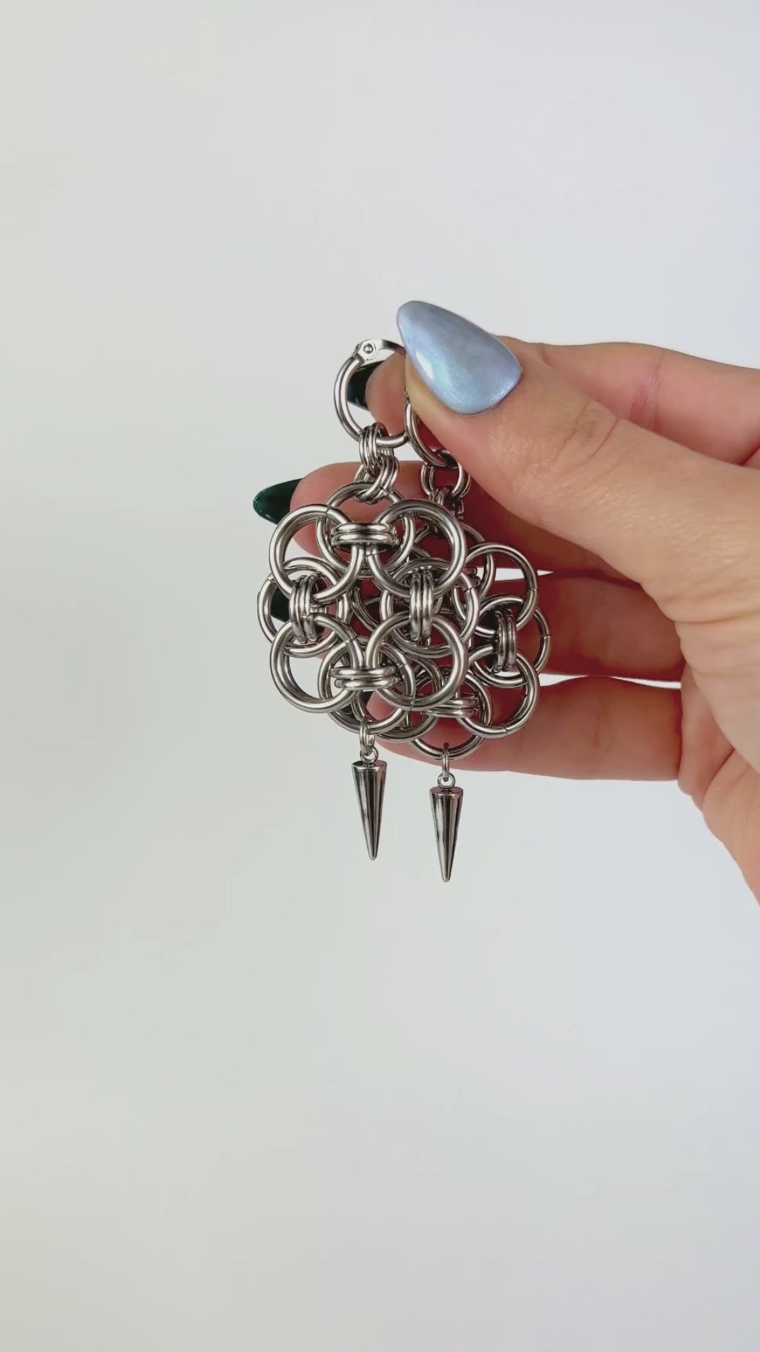 These chainmail rose earrings are bold, alternative, and unapologetically edgy. Each “rose” is crafted from connected Helm chainmail, hanging from hoops and finished with a sharp spike charm. The result is a striking blend of traditional craft and alt fashion, designed to stand out.