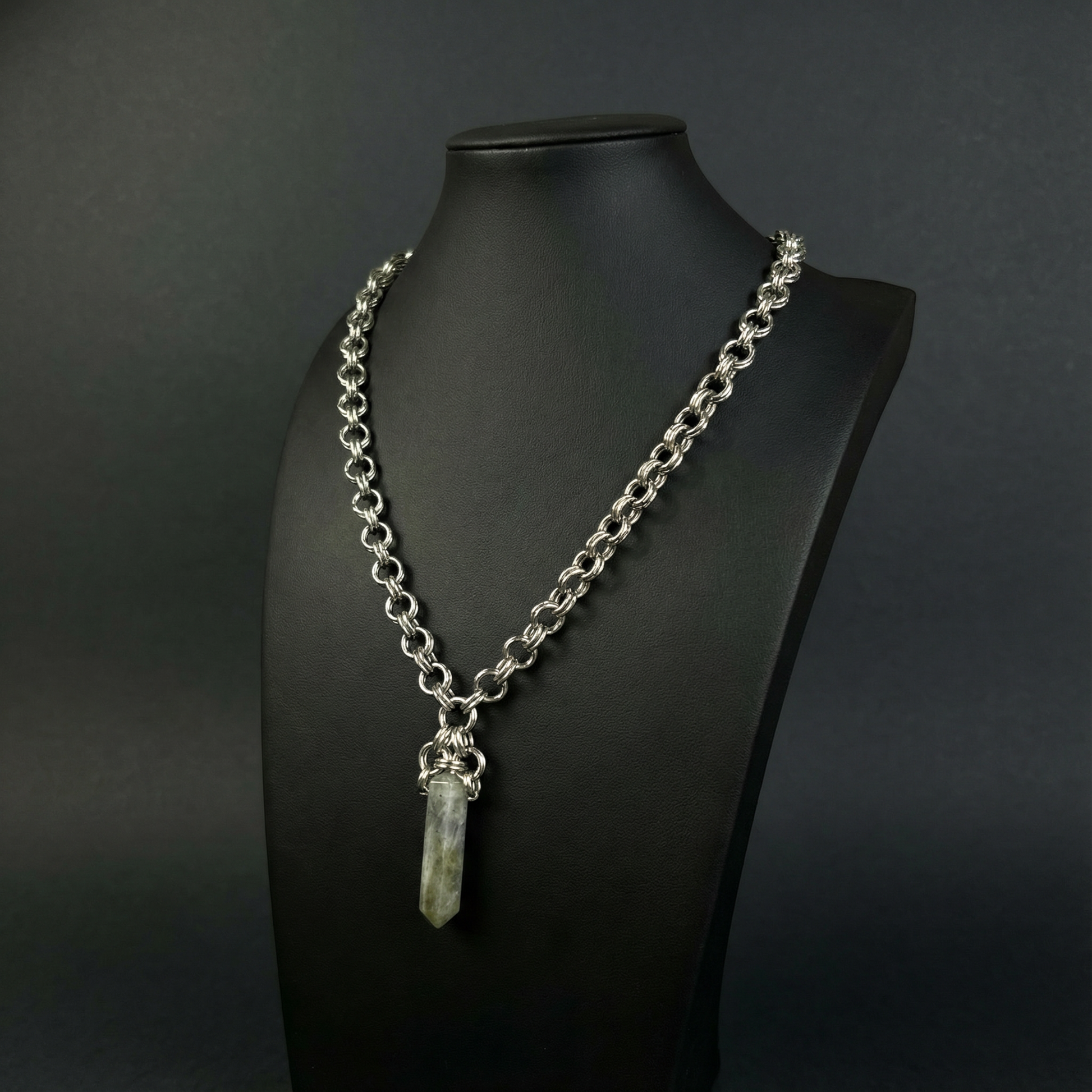 A statement piece that turns a little black dress into a look or elevates a casual fit with effortless edge, this chainmail and labradorite necklace is about to become your daily go-to. Labradorite isn't just a pretty crystal—it’s got that soft, shielding energy that keeps you glowing while blocking the nonsense. Office days, wild nights, coven gatherings, or just sipping your favorite tea like the mysterious enigma you are—this necklace is your signature.