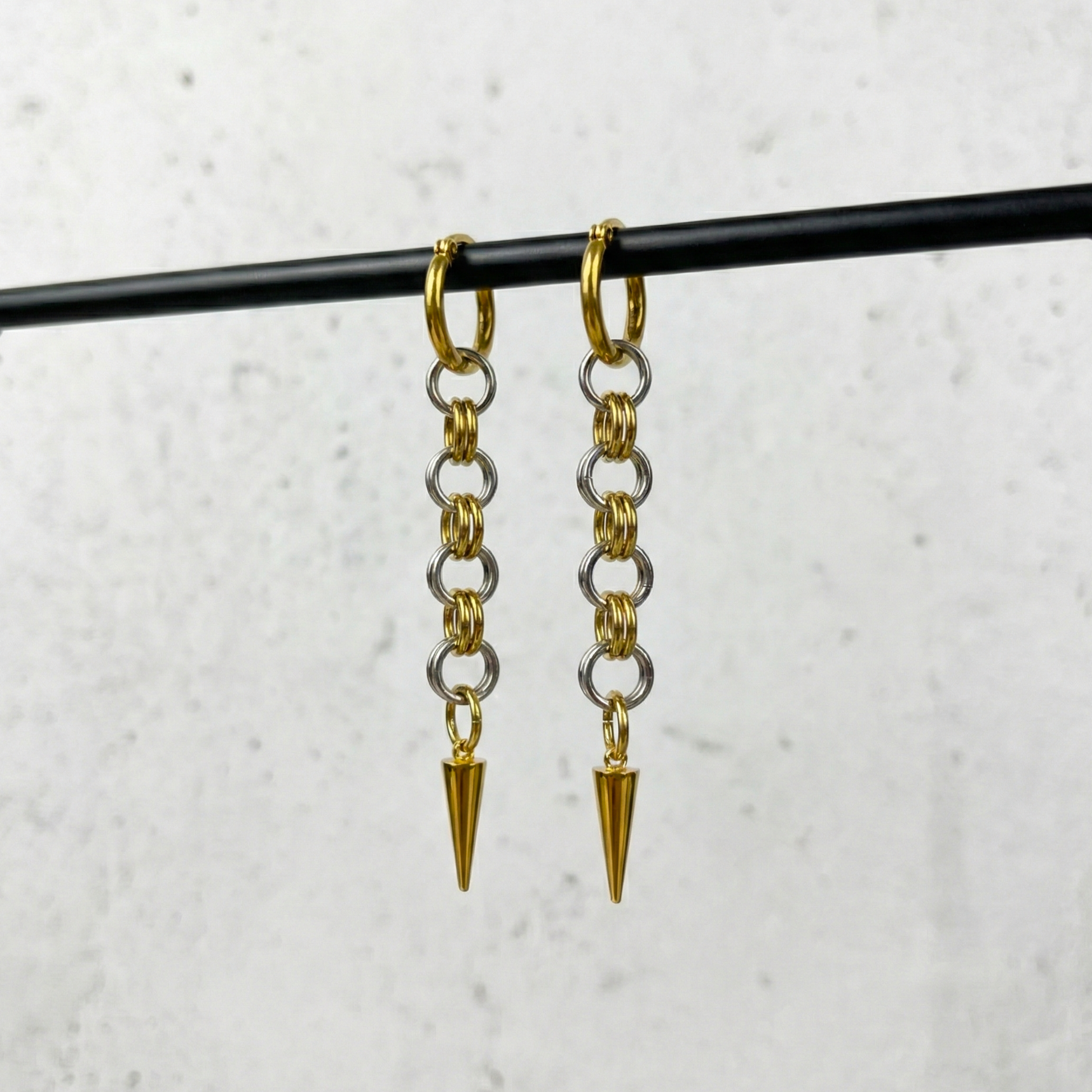 Simple and yet so original, these mixed metal earrings are the jewelry piece your closet was missing:Stainless steel and 18k gold plated stainless steel are paired to create these original mixed tones earrings. The comfortable hoop is adorned with a piece of chainmail, and finished with spikes. Gold and silver alternate for elegant comfort. Wear your earrings completely or only the latch-back golden hoops for a more casual style. These versatile earrings will level up any outfit from day to night.