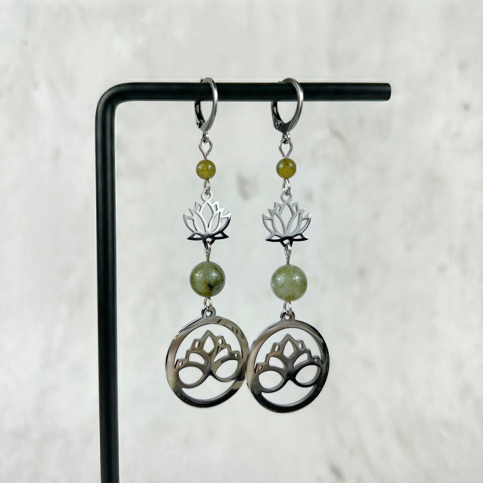 Express your spirituality with these elegant lotus flowers earrings, adorned with gorgeous labradorite gemstones. Lotus flowers are a symbol of spiritual awakening. These earrings are made with stainless steel and labradorite.