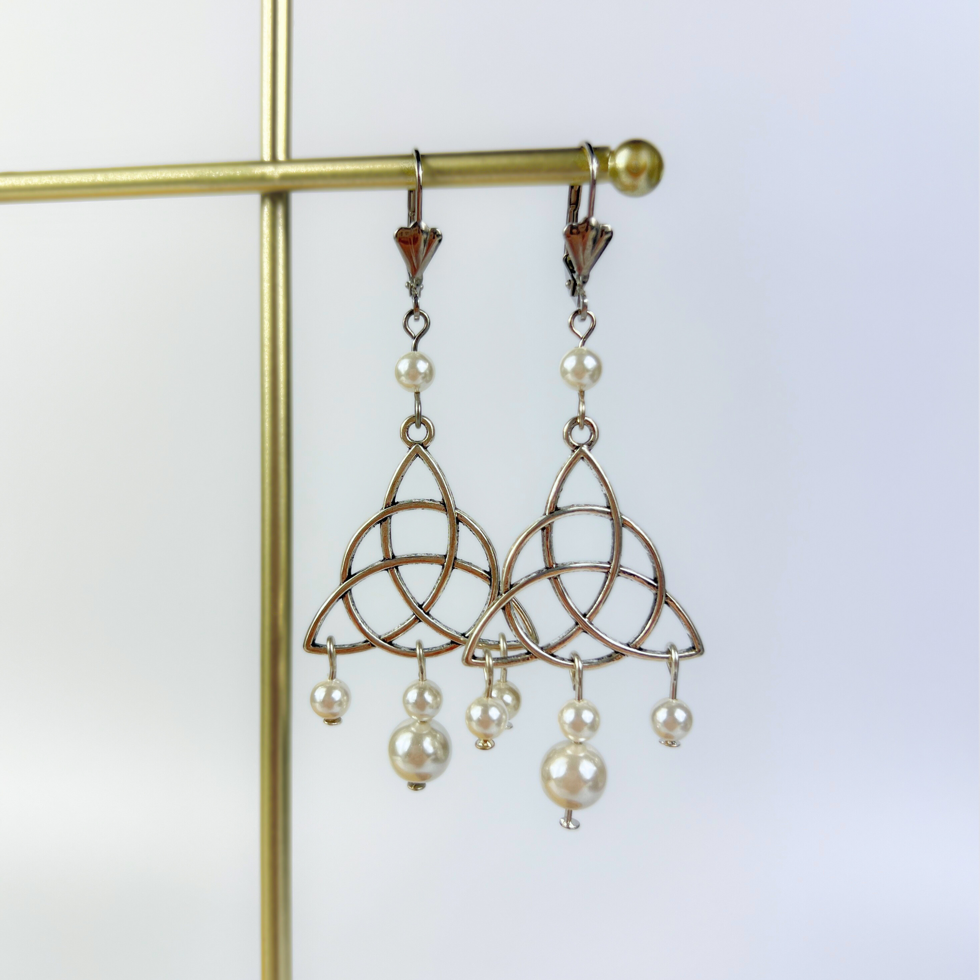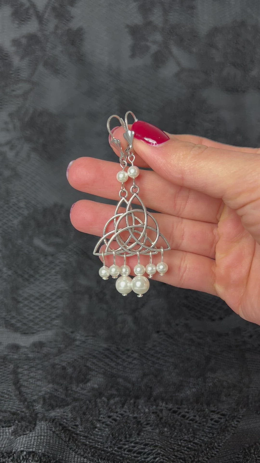 This pendulum has a specific kind of Celtic knot: the trinity knot also called triquetra. It can represent love, devotion, but also triple aspects of life and time. I embellished this important symbol in witchcraft, Wicca, paganism with pearls. I hope these earrings will inspire you!
